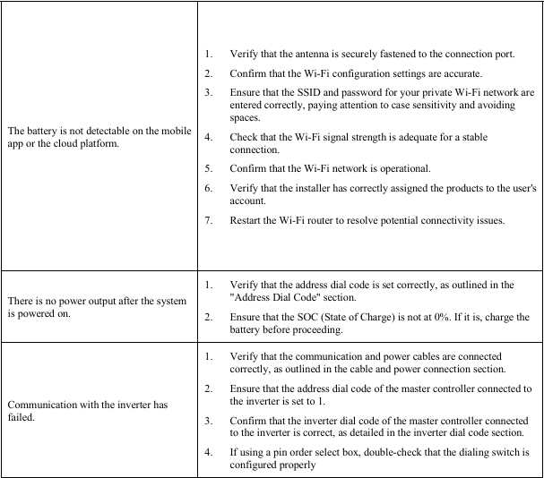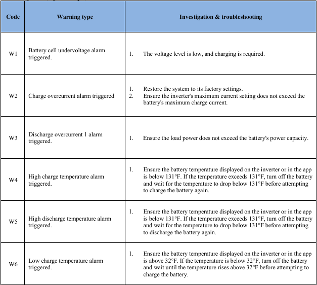 pack—connect only to the inverter. - Ensure correct wiring; verify polarity and avoid short circuits with external devices.