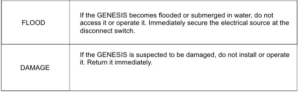 | WARNING: DO NOT DISASSEMBLE OR ALTER THIS GENESIS. Please read this Genesis manual thoroughly before installation and operation. Closely follow all instructions. Failure to follow all safety guidelines can result in personal injury/death, and/or property damage. |