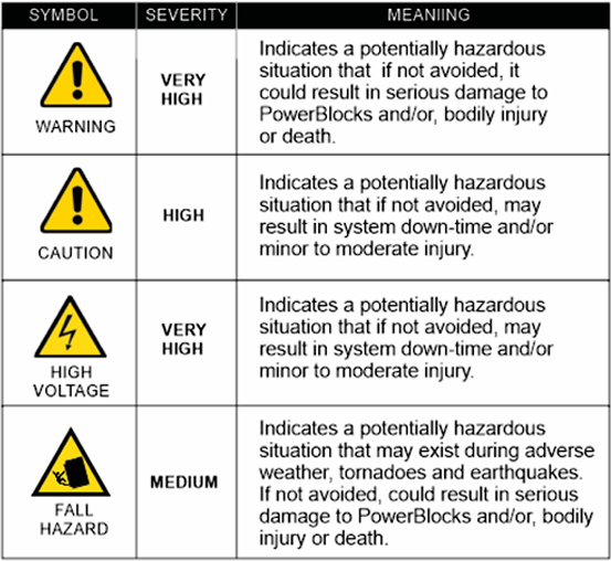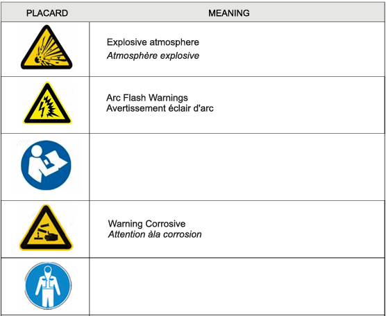 Visual indicators are used in this manual and on the product itself. These symbols represent physical and operational threats and must be observed and understood by users, installers and maintenance personnel.