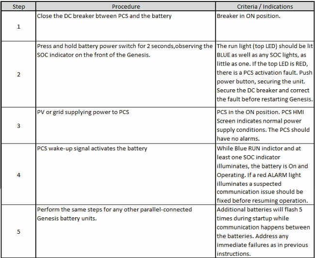 After all the mounting is done and all electrical connections have been made the inverter/PCS will need to communicate with the batteries. This will normally require a power-up operation.